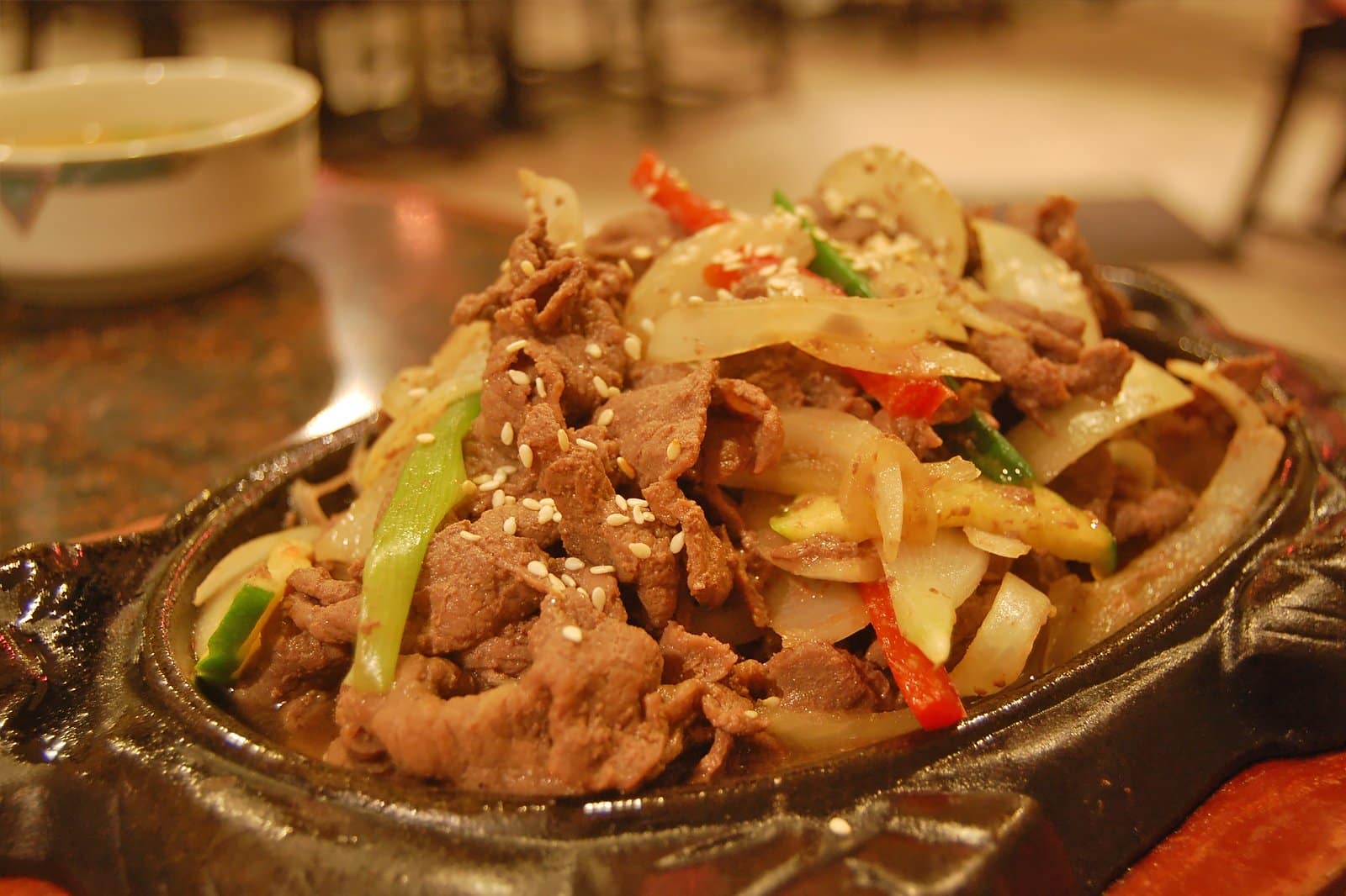 Thin slices of marinated beef sirloin are cooked with chopped onions, green peppers, and garlic over charcoal to produce the distinctively smokey flavor of bulgogi. To improve the flavor and tenderness of the meat, it is marinated for 2 to 4 hours before grilling in a mixture of soy sauce, sesame oil, black pepper, garlic, onions, ginger, and sugar.