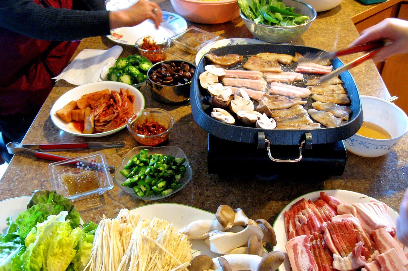 Another typical Korean meal, samgyeopsal, cooks chunky slices of pig belly on a grill right at the table and requires just rudimentary cooking abilities. Following that, it is wrapped in lettuce or sesame leaf and served with dipping sauces and toppings including kimchi, button mushrooms, green onions, raw garlic, and green chili peppers.