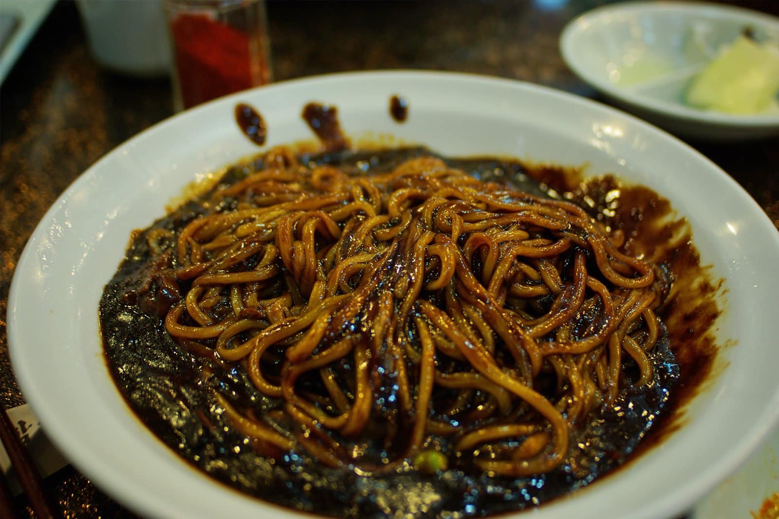 Jajangmyeon is a fusion dish of Korean and Chinese cuisine that uses thick handmade wheat noodles and is topped with raw cucumber slices, salty black soybean paste, chopped pork, and veggies. This hearty noodle dish, which starts at 5,000 won, is excellent for when you need a quick dinner that won't break the bank.