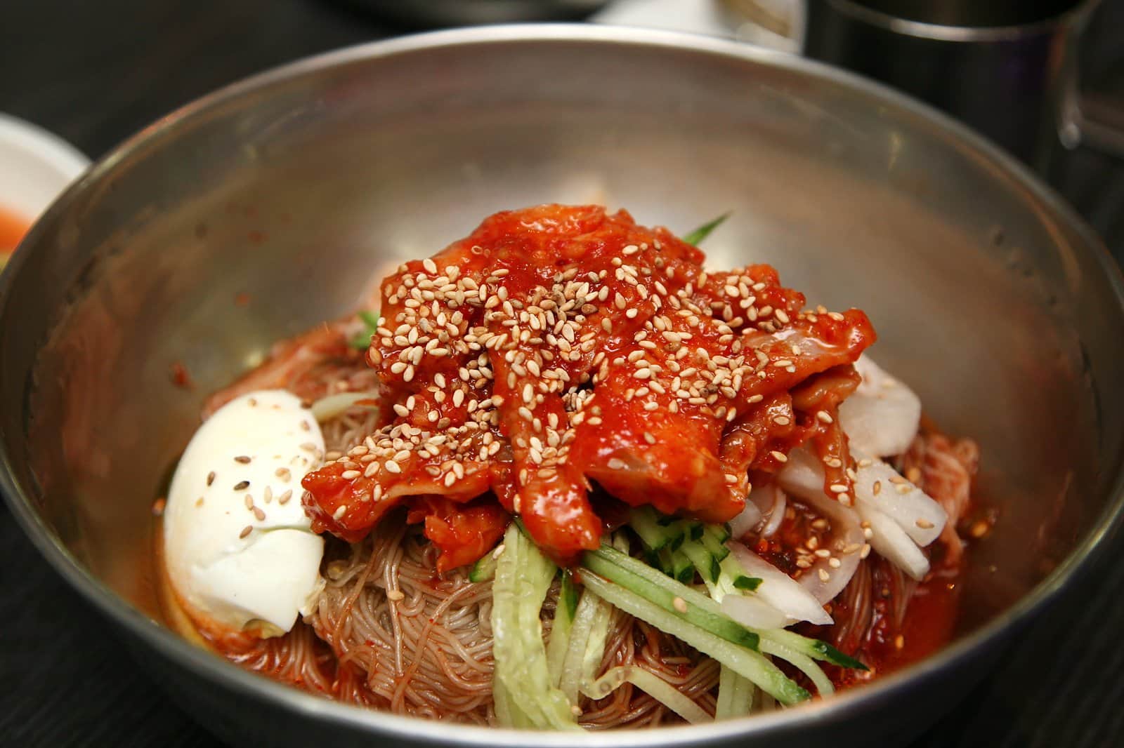 In a stainless steel bowl, Bibim Nengmyun is served with cold broth, julienned cucumbers, Korean pear slices, boiled eggs, and cold-boiled beef slices. Although seaweed and green tea are also used in other varieties, the long, thin noodles are created from flour and buckwheat or sweet potatoes.